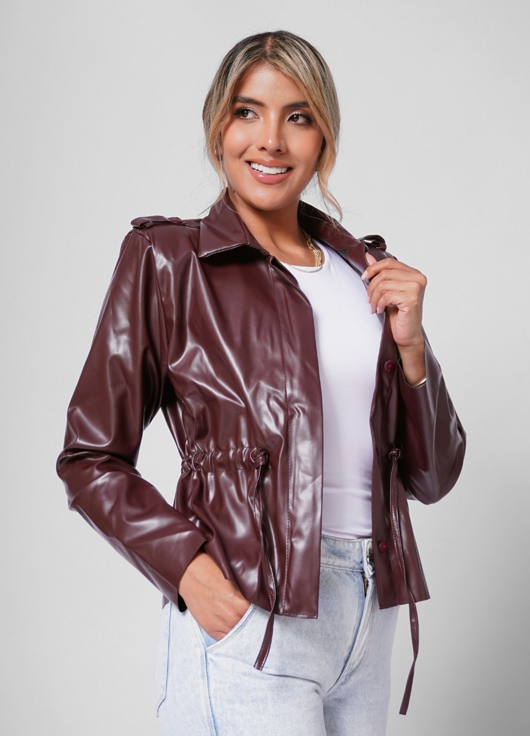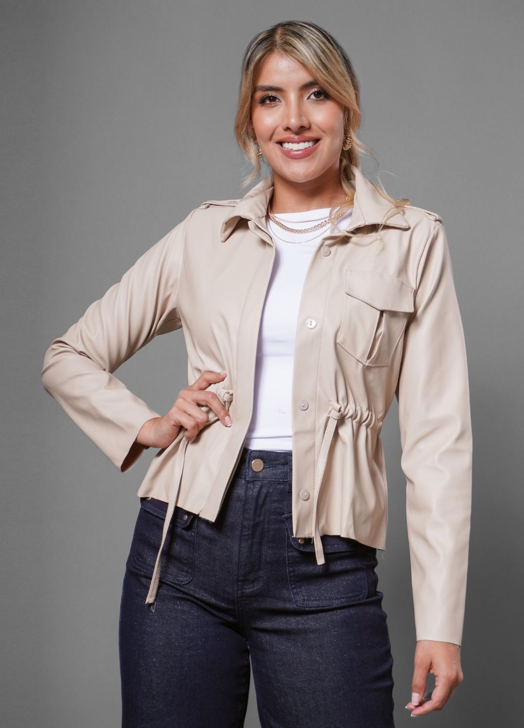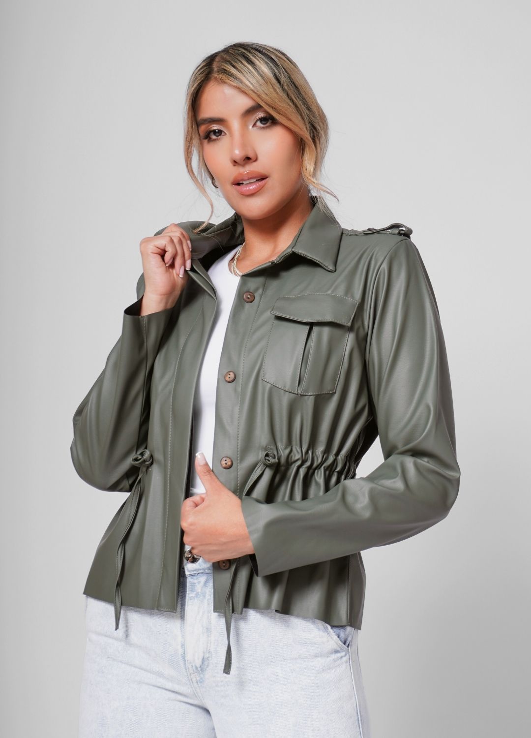 Chaqueta efecto polipiel con bolsillos funcionales en el pecho, recogido en la cintura y cuello camisero.