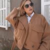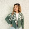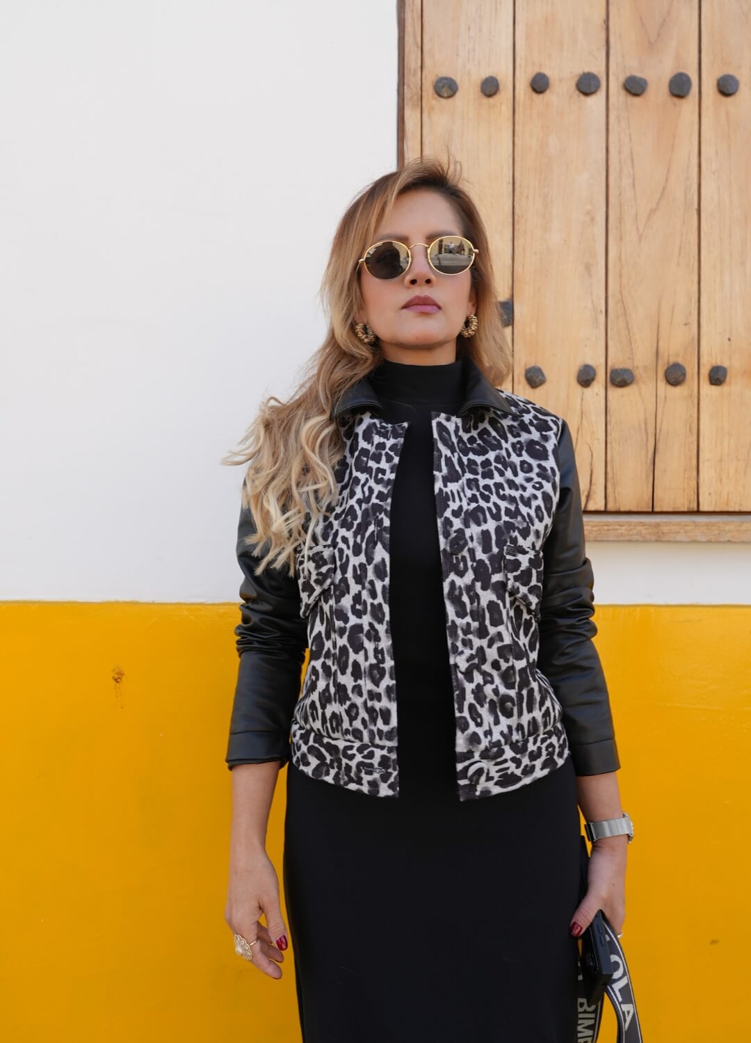 Chaqueta en paño estampada con mangas y cuello en cuero textil (Cuero no animal), botones forrados en la misma tela, bolsillos funcionales e interior forrado.