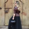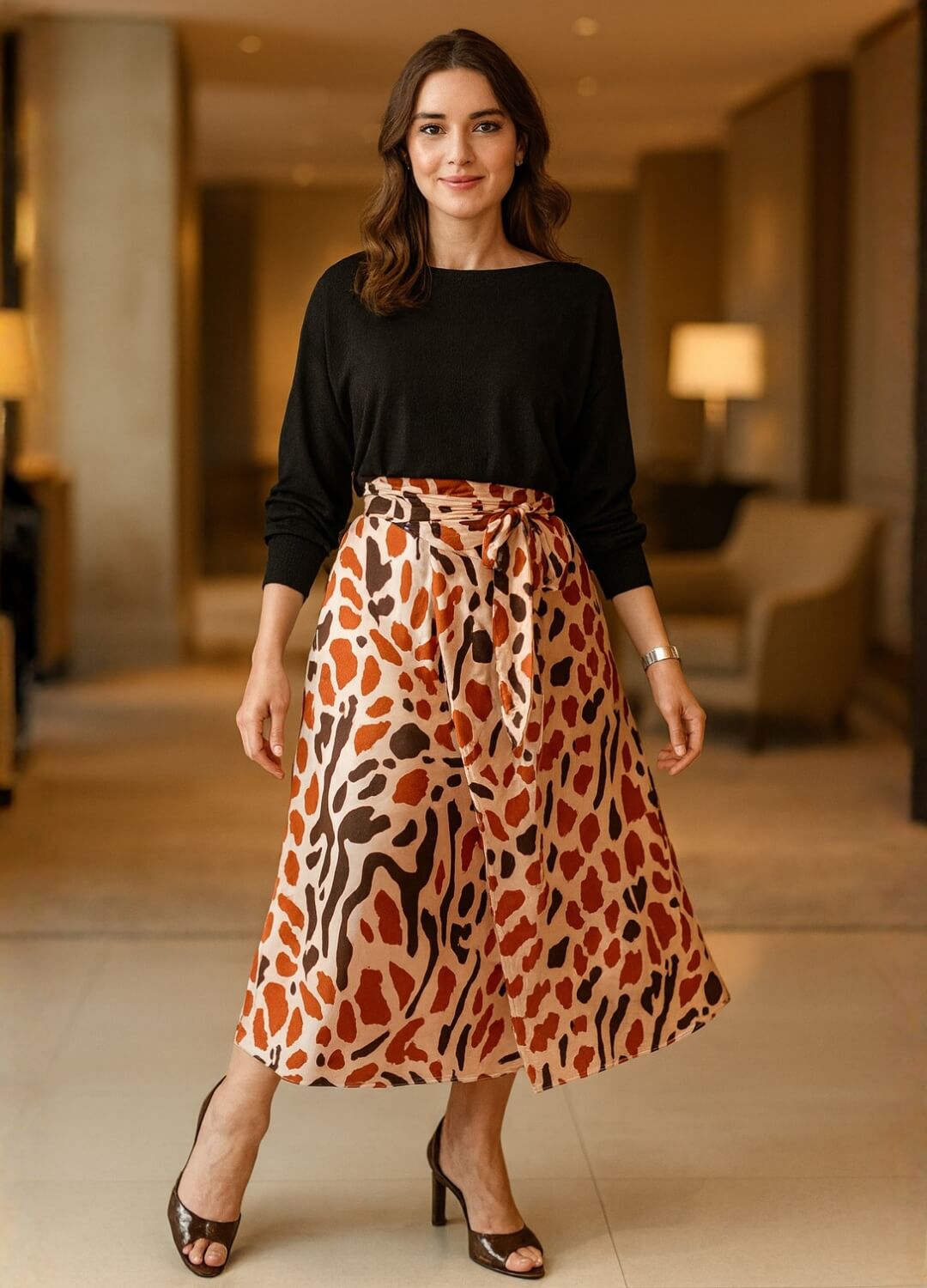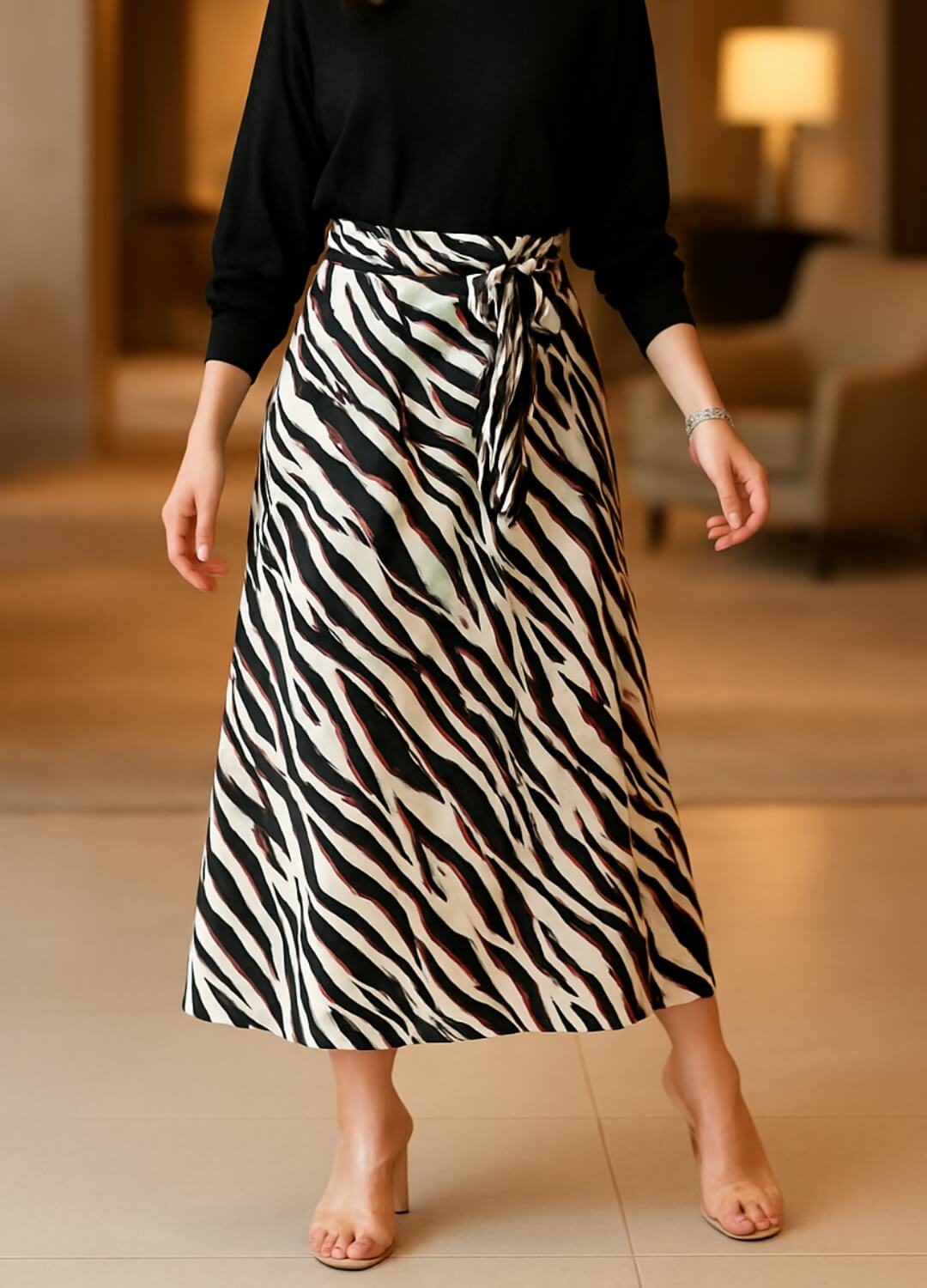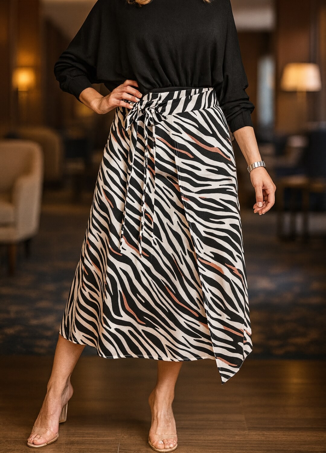 Falda en satín estampad. Incluye cinturón del mismo material para ajustar a tu estilo y cremallera invisible.
